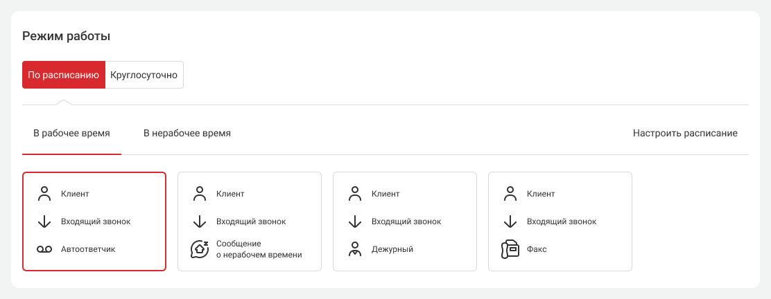 Рекомендуем выбрать «По расписанию», чтобы в нерабочее время ваши клиенты слышали информацию об этом и могли оставить вам голосовое сообщение.