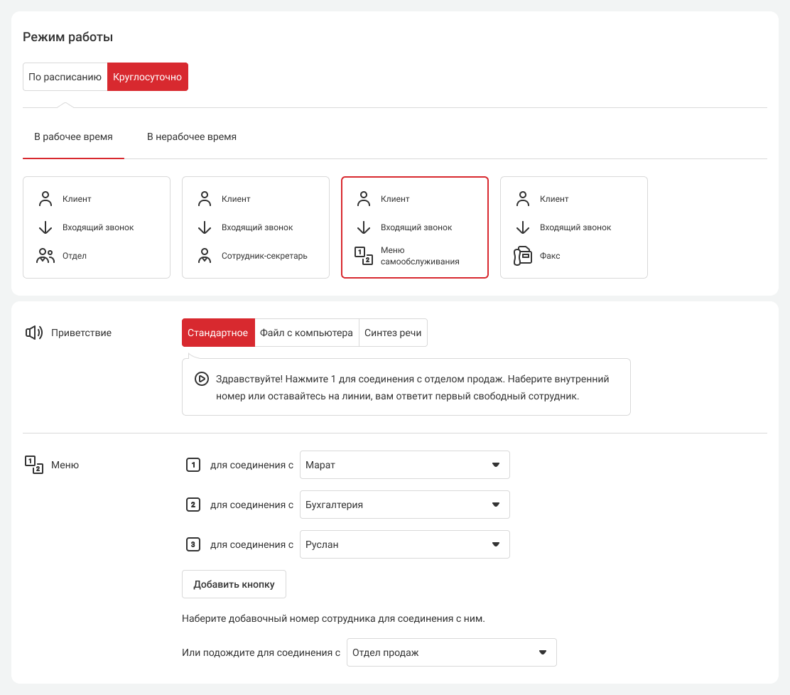В рабочее время звонок может быть отправлен в отдел, на сотрудника или голосовое меню (IVR). В каждом варианте вы можете использовать стандартное голосовое приветствие, загрузить свое или синтезировать речь в ВАТС.