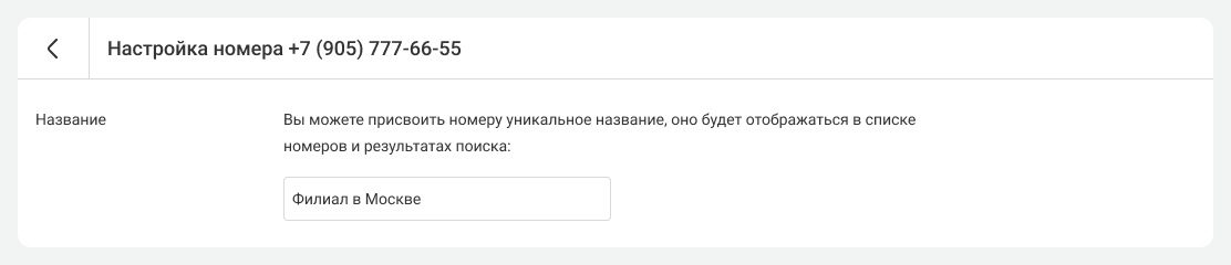 На странице с настройками номера введите уникальное название. Оно должно быть коротким (не более 60 символов) и информативным. Например, «Офис в Москве» или «Отдел продаж». Внизу страницы не забудьте нажать на кнопку «Сохранить».
