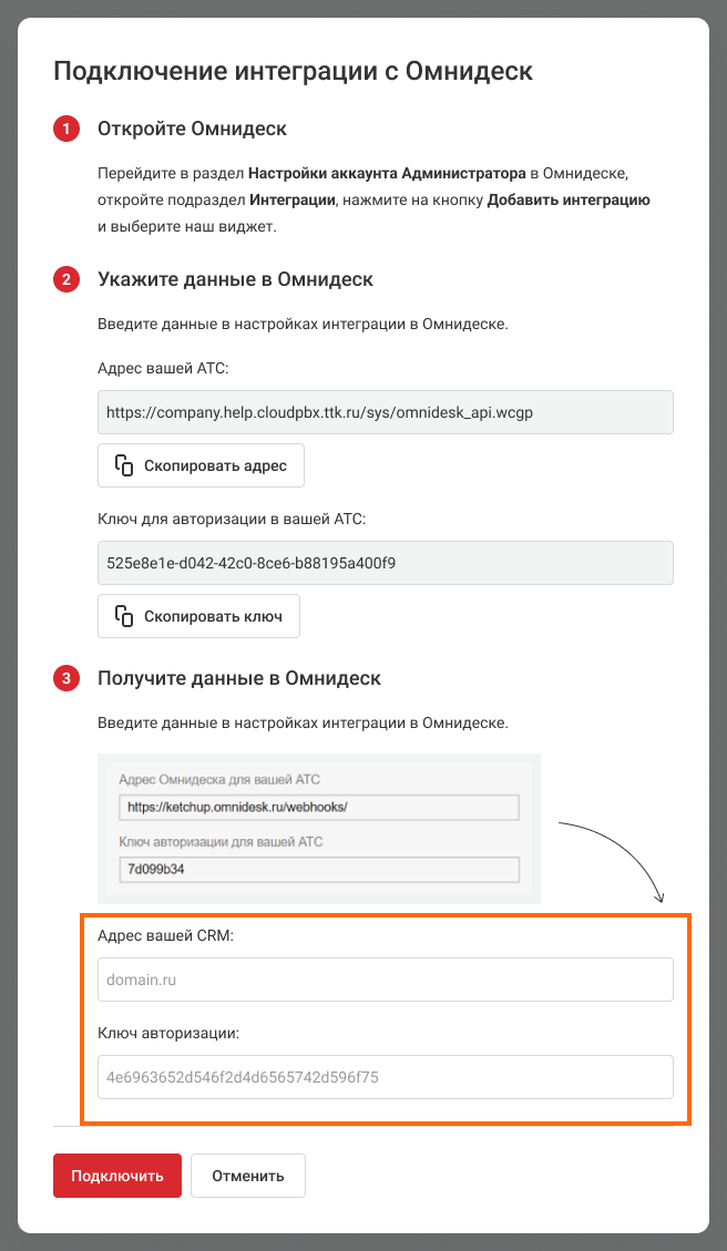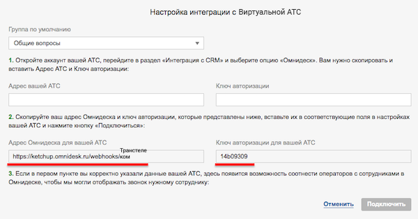 Там вы увидите адрес Омнидеска для вашей АТС и ключ авторизации. Скопируйте эти данные.