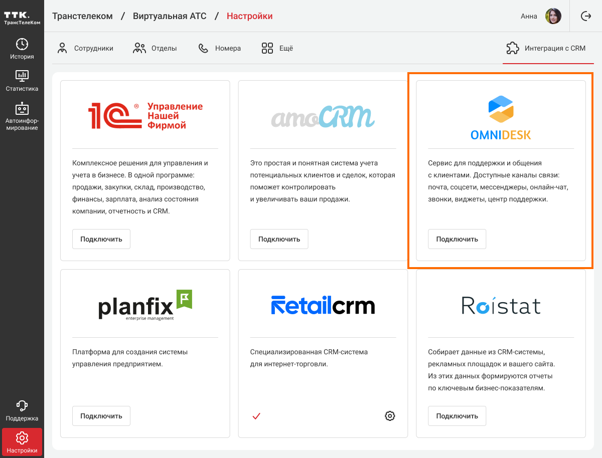 Теперь зайдите в настройки вашей Виртуальной АТС, в раздел «Интеграции с CRM». Нажмите на интеграцию с Omnidesk.