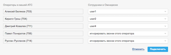 В Омнидеск автоматически подтянутся сотрудники из Виртуальной АТС, их нужно будет сопоставить вручную.