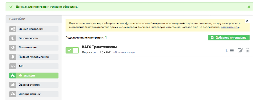 В настройках Омнидеск нажмите Сохранить изменения. Интеграция включена и работает.