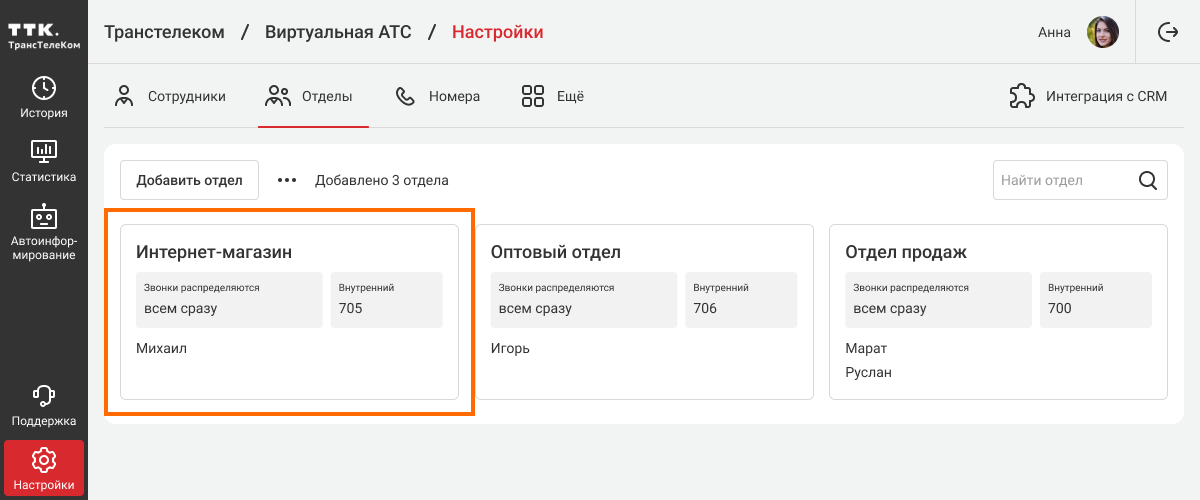 1. Зайдите в «Настройки» – «Отделы» и выберите карточку нужного отдела.