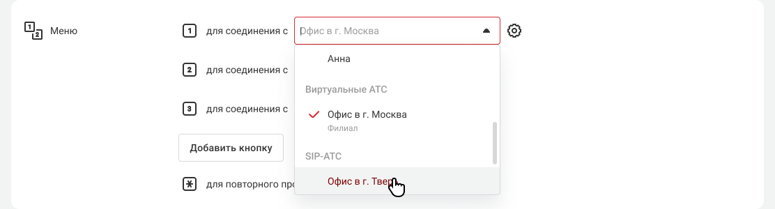 2. Откройте раскрывающийся список рядом с кнопкой, которую хотите назначить для перевода вызова на сотрудника из другой АТС. Найдите в списке блок «Виртуальные АТС», если хотите сделать сотрудника из другой ВАТС доступным через голосовое меню. Если хотите добавить внутренний номер сотрудника SIP-АТС — найдите блок «SIP-АТС».