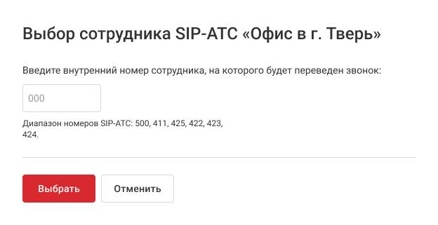 • Если это SIP-АТС, то введите внутренний номер сотрудника. Чтобы вам не пришлось искать его номер в настройках SIP-АТС, под окном ввода номера перечислен весь диапазон доступных номеров выбранной АТС.