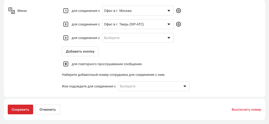 Можно добавить сотрудника из другой АТС в голосовое меню — для соединения с ним нужно будет набрать внутренний номер или выбрать направление звонка в IVR. Для этого: