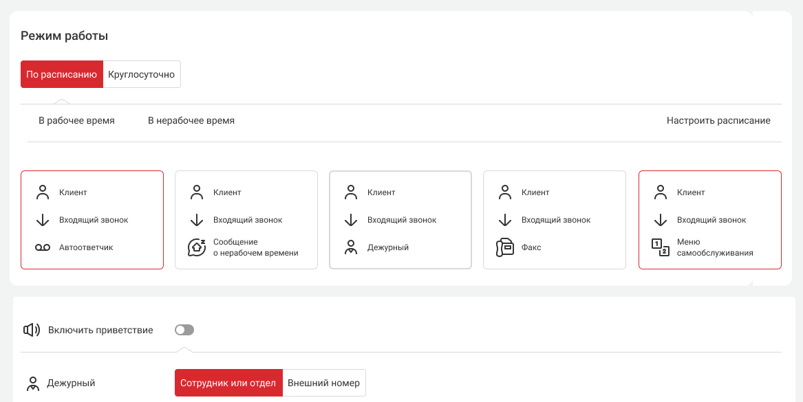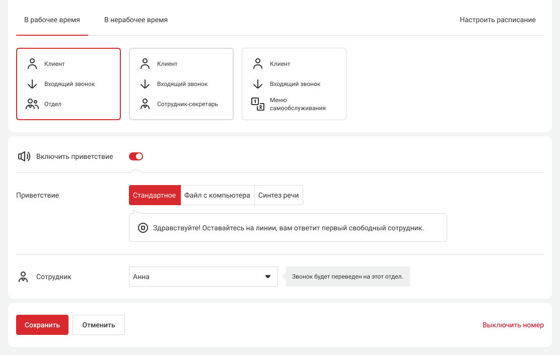 1. В настройках номера выберите режим работы «По расписанию» и перейдите на вкладку «В рабочее время». Выберите сценарий «Клиент – Входящий звонок – Сотрудник-секретарь».