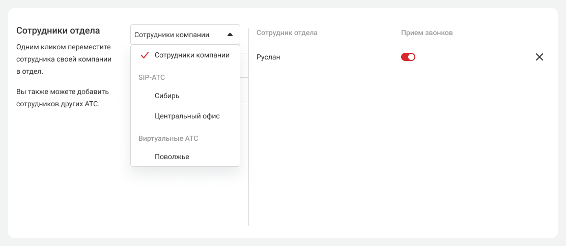 2. В блоке «Сотрудники компании» в раскрывающемся списке выберите нужную офисную или Виртуальную АТС.