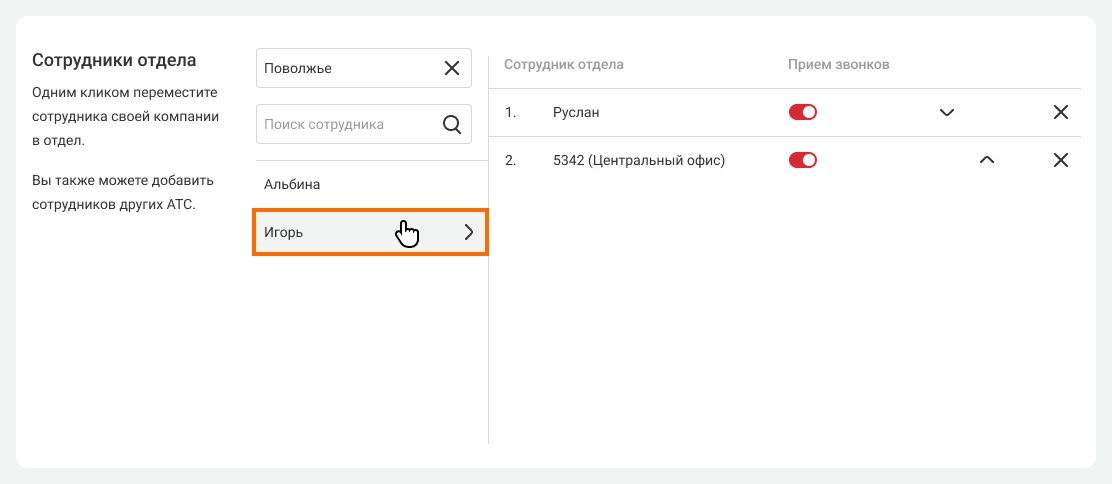 4. Вы можете изменить порядок приема звонков сотрудниками из других АТС, временно исключить их из этой очереди или вовсе удалить из отдела так же, как и любого другого менеджера ВАТС.