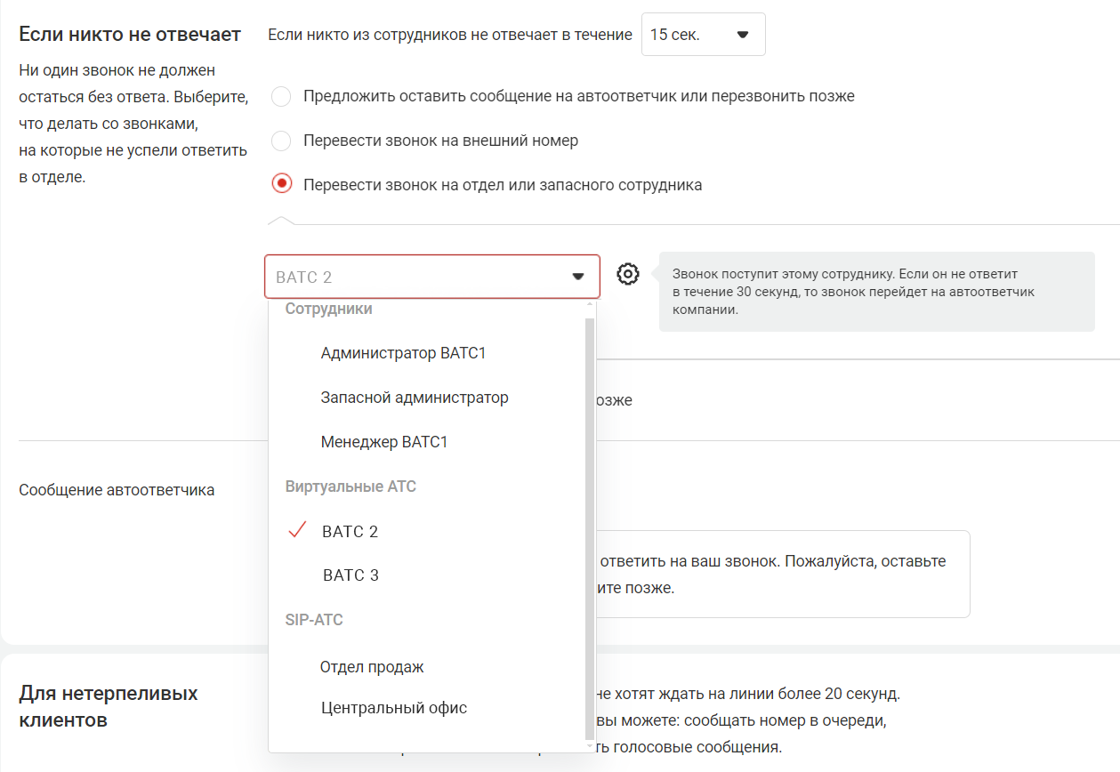 Когда сотрудники отдела не отвечают в течение определенного количества времени, звонок можно переводить на запасного сотрудника или отдел (подробнее про настройки времени ожидания читайте в статье Гибкая настройка времени ожидания). Для этого в настройках отдела в блоке «Если никто не отвечает» нужно выбрать «Перевести звонок на отдел или запасного сотрудника». Чтобы использовать сотрудника другой АТС в качестве запасного, в раскрывающемся списке укажите другую АТС.