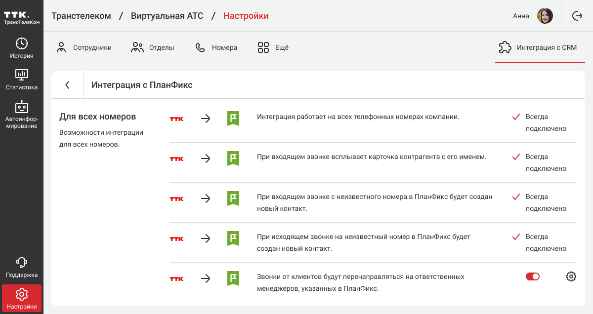 Если вы хотите, чтобы при звонке на номер вашей компании клиент не терял времени на первой линии или IVR и сразу соединялся со своим персональным менеджером, включите данную опцию в настройке интеграции в интерфейсе Виртуальной АТС.