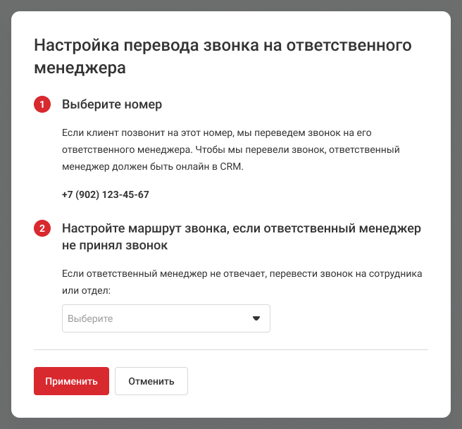 А затем данную опцию: выберите номер и настройте маршрут звонка, если ответственный менеджер не принял звонок. Можно перевести звонок на сотрудника или отдел.