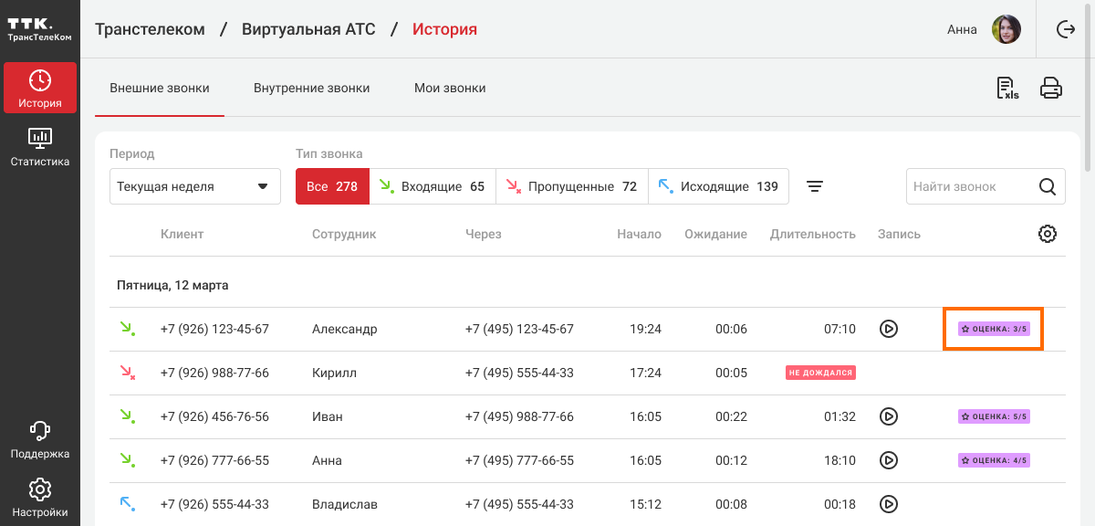 3. Оценка клиента сохранится в Виртуальной АТС и отобразится в разделе История.
