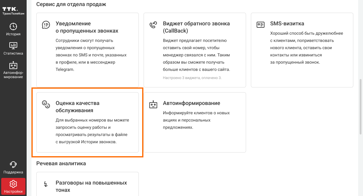 1. В настройках вашей Виртуальной АТС перейдите в раздел «Еще» и найдите там опцию «Оценка качества обслуживания».