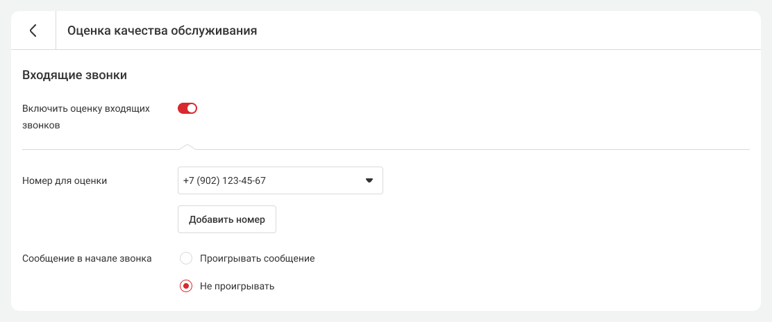 2. Включите оценку входящих звонков. В появившемся поле укажите номера АТС или номерные группы, на которые будут поступать вызовы, подлежащие оценке. Система будет автоматически предлагать клиентам оценить разговор после завершения беседы.