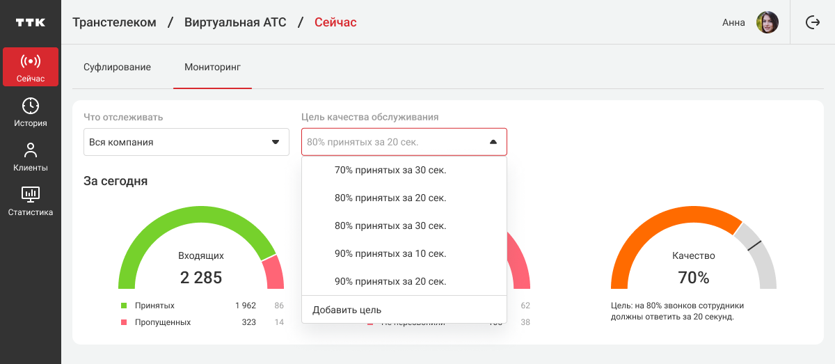 • Качество – доля входящих звонков, на которые сотрудники ответили в течение установленного времени (например, за 20 секунд).