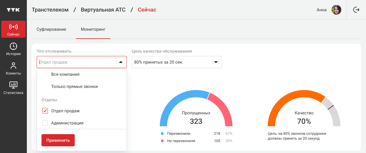 В боковом меню перейдите в раздел «Сейчас» — откроется вкладка «Мониторинг». По умолчанию будет показана статистика по всей компании. В фильтре «Что отслеживать» можно выбрать нужные отделы или настроить показ только прямых звонков сотрудникам на внутренние номера.