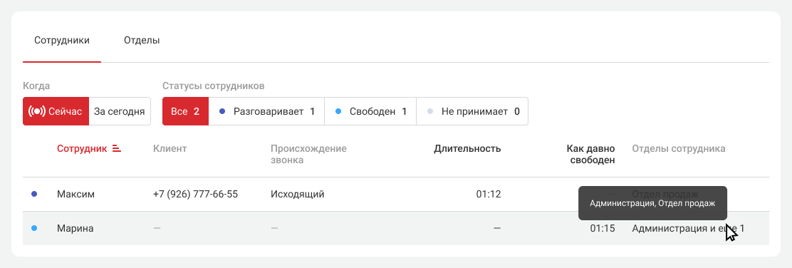 • Свободны: сколько менеджеров не участвует в звонках, кто из них дольше всех не разговаривал и как давно общался по телефону с клиентом в последний раз.