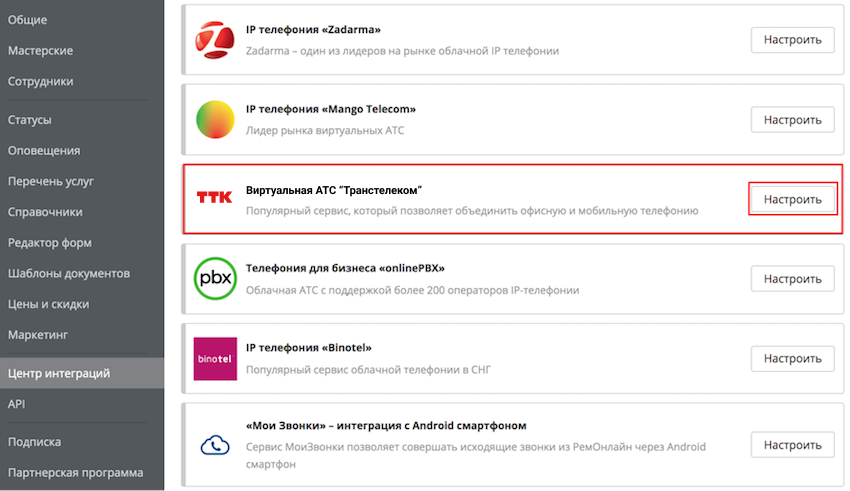 Войдите в свой аккаунт РемОнлайн и перейдите на страницу “Настройки > Центр интеграций”. Найдите там Виртуальную АТС МегаФон и нажмите “Настроить”. Перед вами откроется окно настройки интеграции РемОнлайн с Виртуальной АТС.