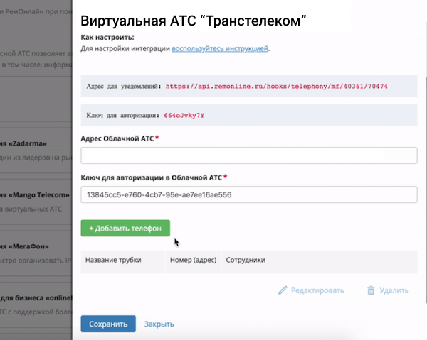 Добавьте внутренние номера Виртуальной АТС в окно настройки интеграции в РемОнлайн. Для этого нажмите на “+Добавить телефон”, введите номер и имя трубки, выберите сотрудников, у которых будет к ней доступ.