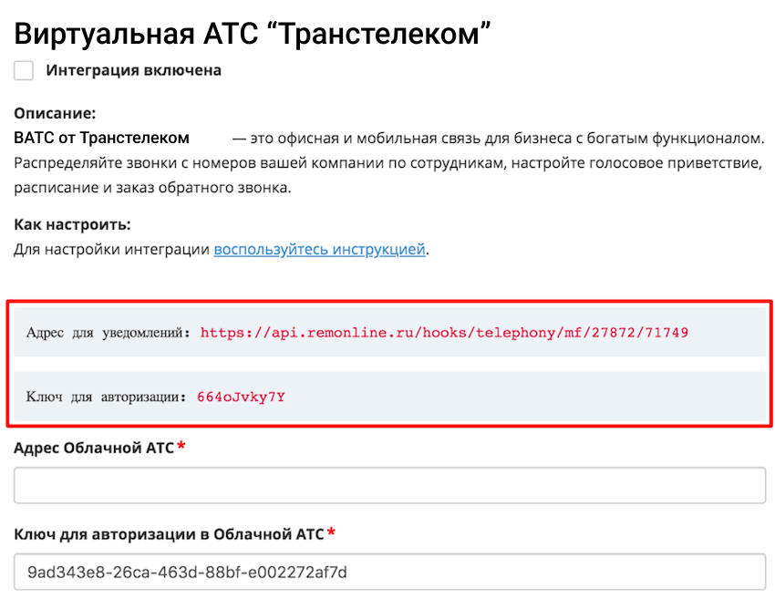 Cкопируйте из настроек ВАТС параметры “Адрес Виртуальной АТС” и “Ключ для авторизации в Виртуальной АТС”, вставьте их в соответствующие поля в настройках интеграции в РемОнлайн.