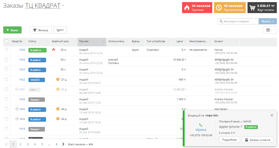 Если всё было выполнено правильно, при клике на телефонный номер клиента появится выпадающий список трубок, с которых можно инициировать звонок. Если на эту трубку поступит звонок, в правом нижнем углу экрана появится карточка входящего вызова.