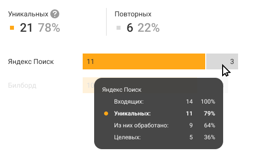 У вас может быть много номеров для разных рекламных каналов. На диаграмме справа вы сможете легко сопоставить каналы по эффективности, ведь в ней отображается не только число уникальных и целевых звонков, но и их доля среди всех звонков с этого источника трафика.