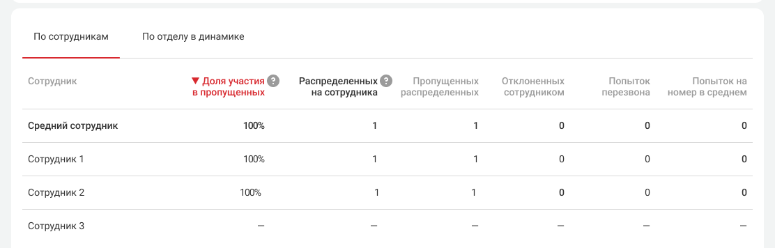 • Средний сотрудник. Показатели в этой строке считаются как среднее арифметическое по сотрудникам, у которых есть хотя бы один пропущенный звонок за выбранный период.