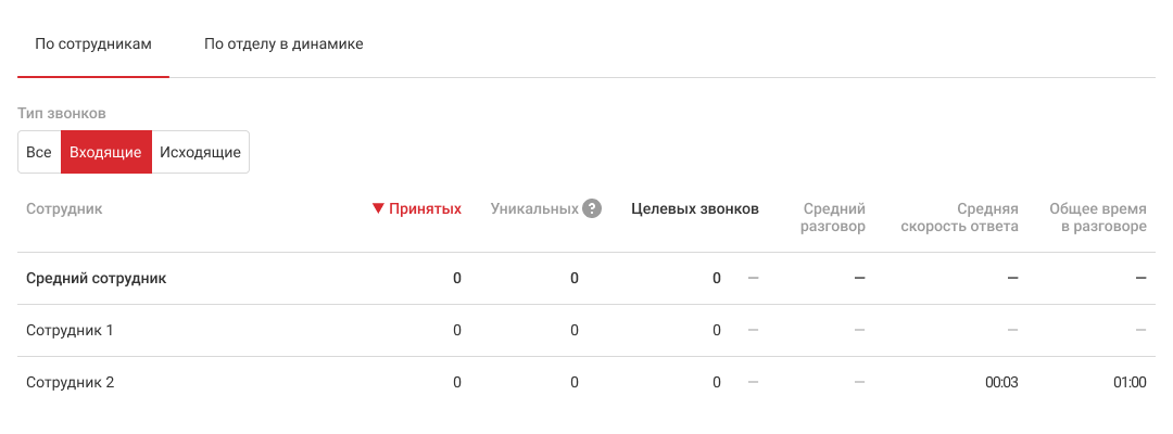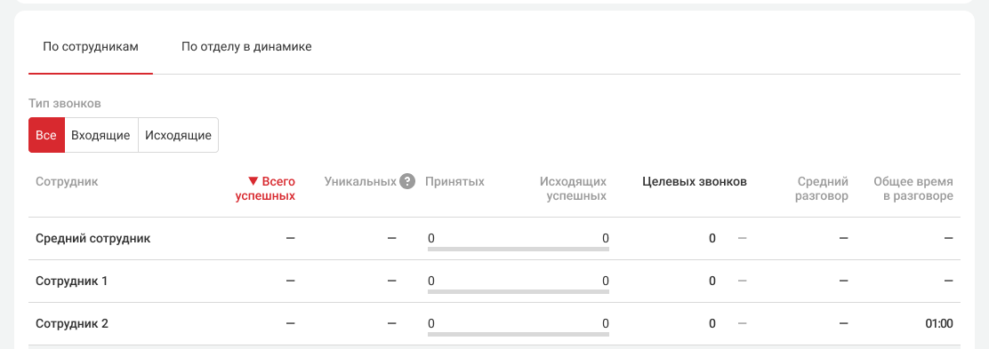 Средний сотрудник. Показатели в этой строке считаются как среднее арифметическое по сотрудникам, у которых есть хотя бы один успешный звонок за выбранный период.