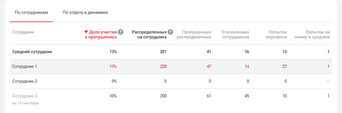 • Попыток перезвона по пропущенным отделом — насколько активно сотрудник участвует в процессе перезвона на пропущенные отделом;