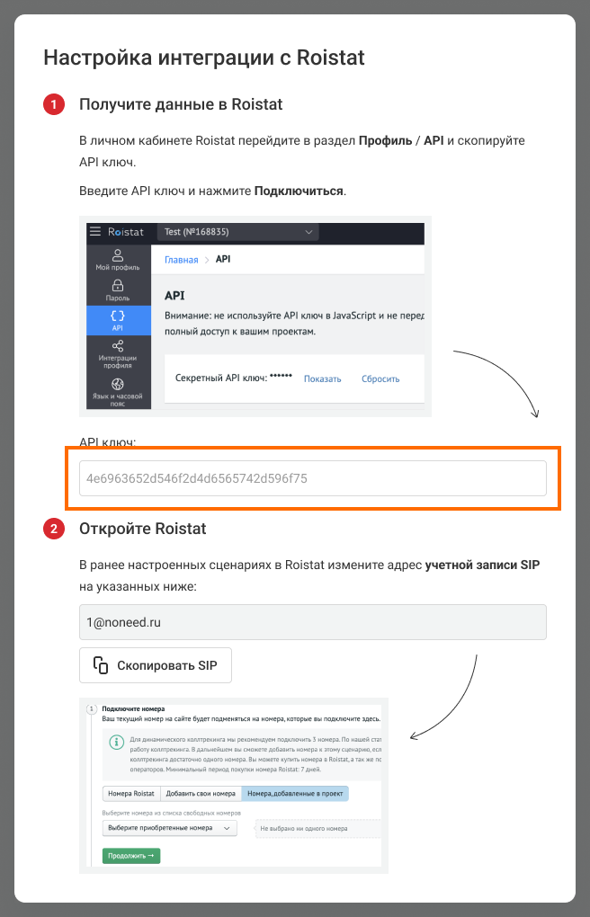 4. Вернитесь на вкладку Виртуальной АТС с настройками интеграции, вставьте скопированный ключ API и нажмите кнопку «Подключиться».