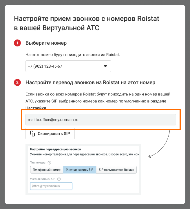 6. Выберите номер Виртуальной АТС, на который будут перенаправляться звонки с номеров Roistat. Скопируйте сгенерированный SIP-адрес. Нажмите кнопки «Применить» и «Сохранить».