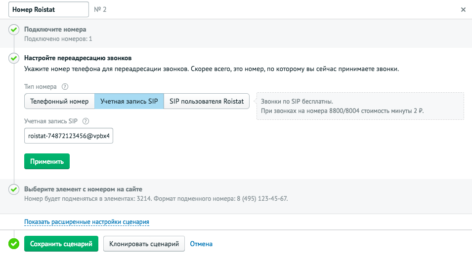 11. Готово! Теперь звонки со всех номеров Roistat, настроенных в сценарии, будут переадресованы в Виртуальную АТС.