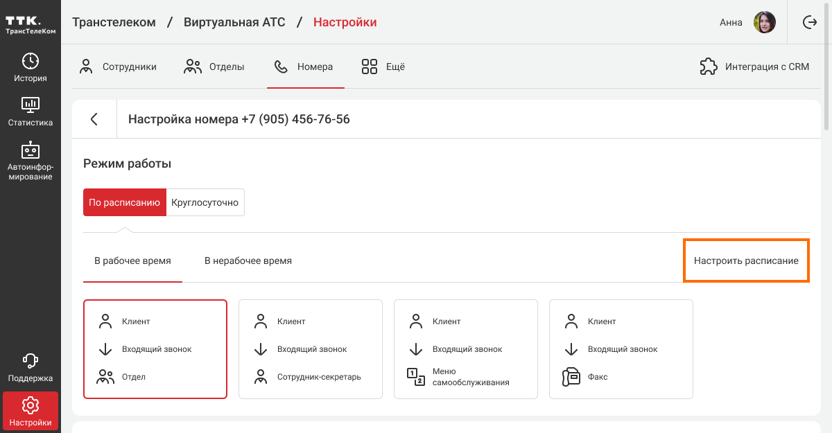 Выберите номер, для которого нужно установить расписание. В разделе «Режим работы» перейдите на вкладку «По расписанию» и нажмите «Настроить расписание».
