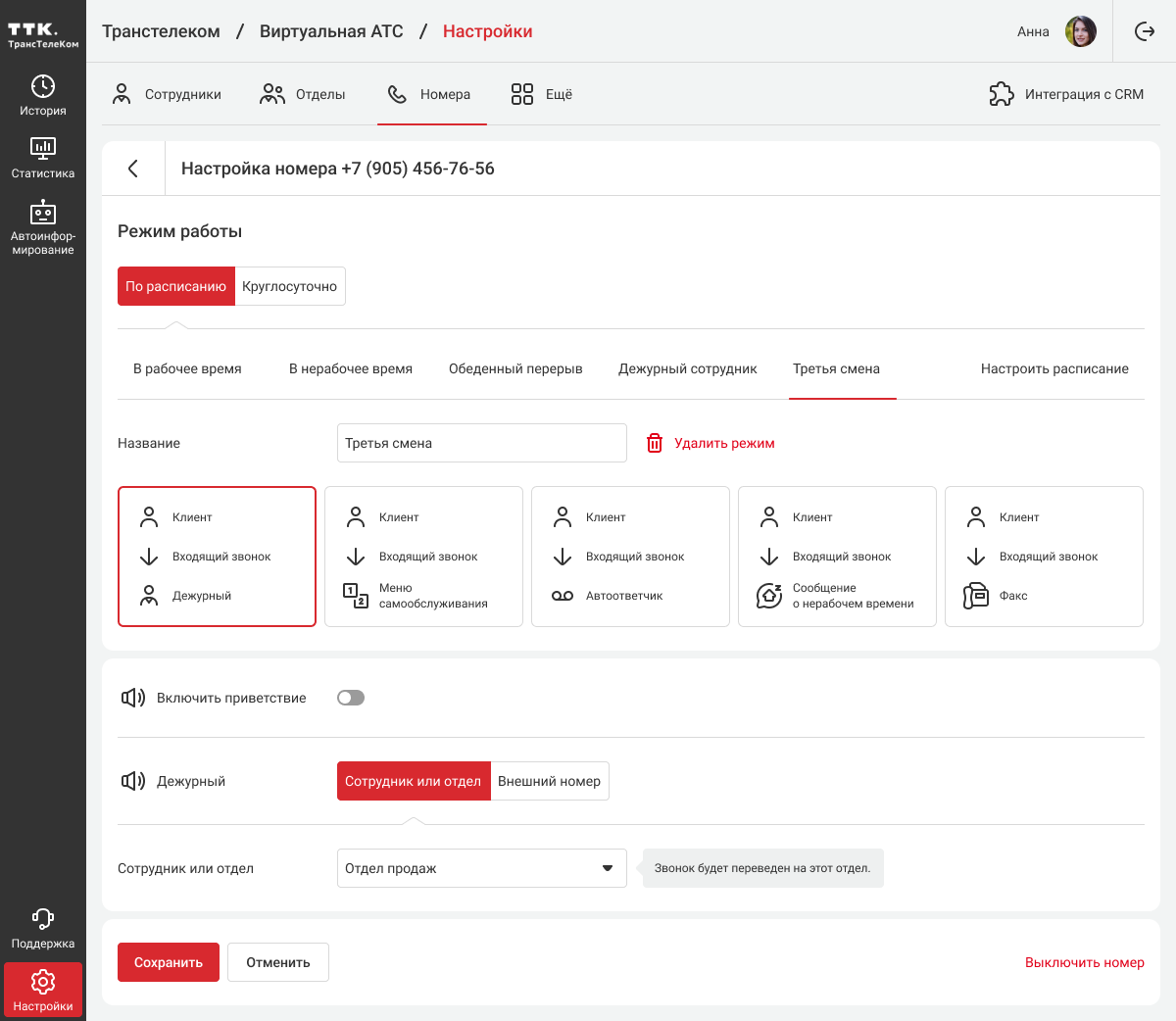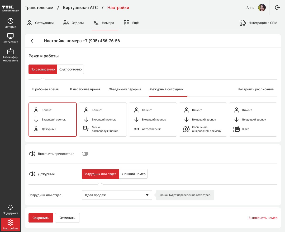Персональный график работы менеджера устанавливается на вкладке «Сотрудники» в настройках его профиля. В нерабочее время АТС будет исключать сотрудника из очереди приема звонков в отделе и переводить все прямые вызовы, поступившие на его внутренний номер, на коллегу или в отдел. При этом клиенты услышат уведомление об отсутствии менеджера и будут готовы, что им ответит другой специалист.