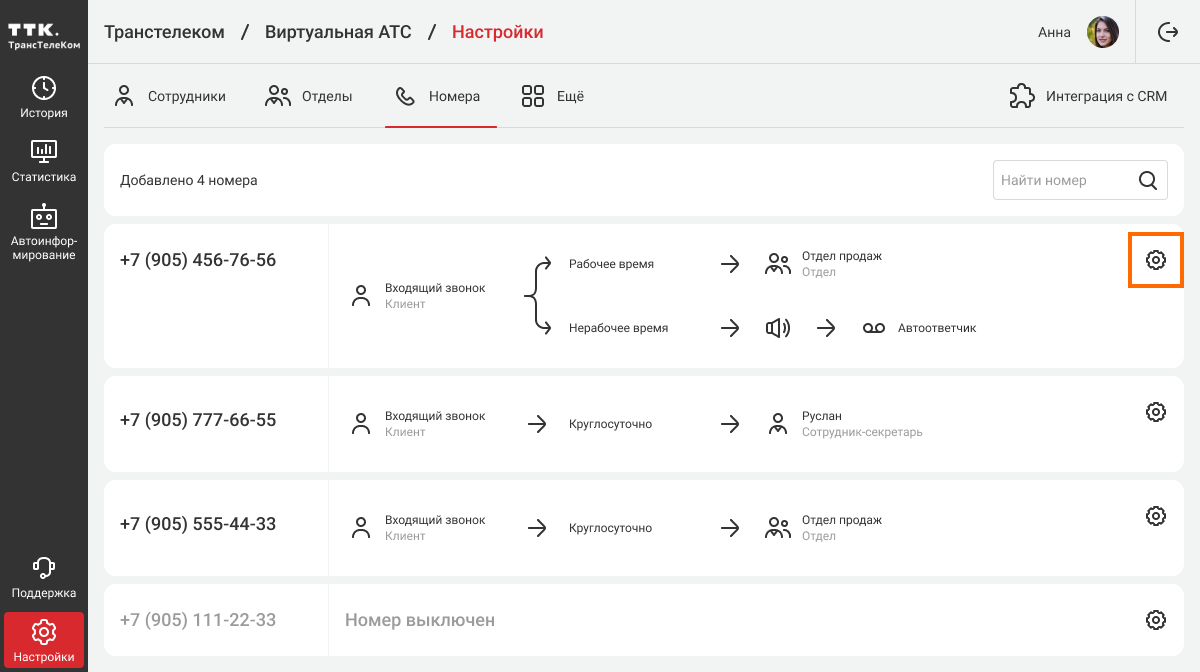 1. В разделе «Номера» – «Общие номера компании» выберите номер, один из режимов которого нужно удалить, и перейдите в его настройки.