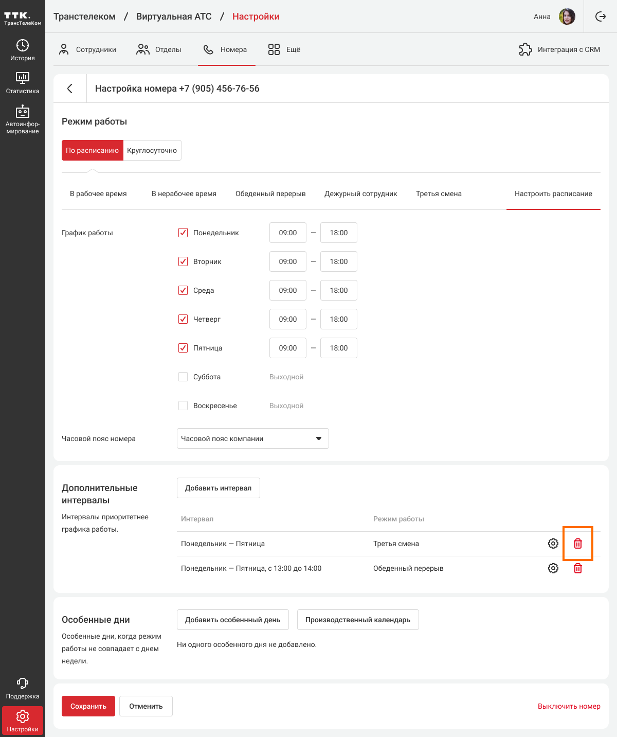 2. Нажмите «Настроить расписание». В блоке «Дополнительные интервалы» найдите режим, который хотите удалить (в нашем примере – «Третья смена»), и нажмите на «корзину» справа.