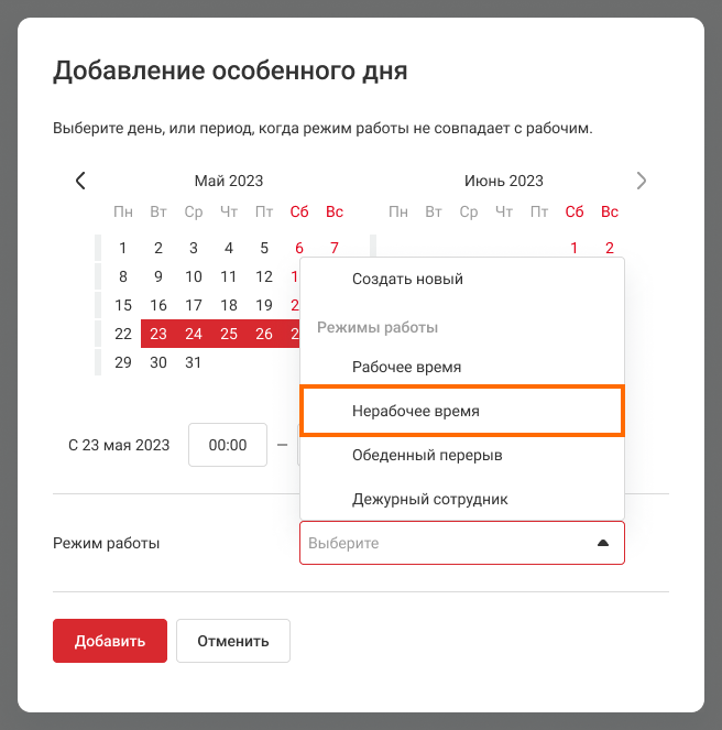 - особенный день – 16 мая с 8:00 до 9:00. И выберите режим работы для этого интервала – нерабочее время или дежурный сотрудник;