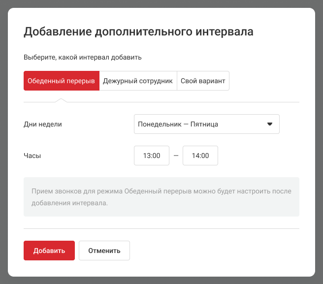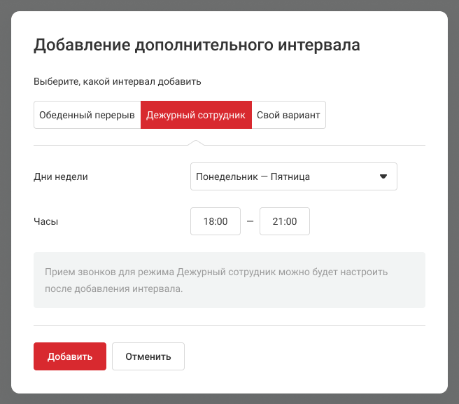 Если работа в вашей компании организована сложнее и для создания корректного расписания вам недостаточно указать время обеденного перерыва и дежурства, вы можете создать собственный дополнительный интервал и настроить для него правила обработки входящих. Своих дополнительных интервалов может быть сколько угодно.