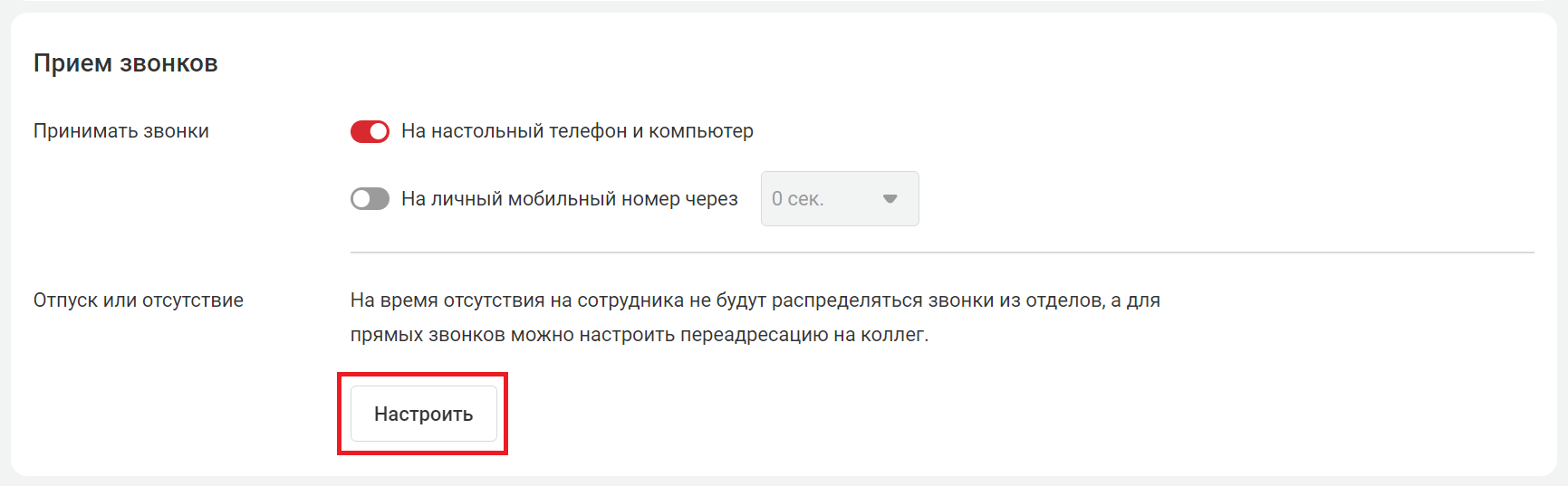 2. Откроются настройки профиля сотрудника. Пролистайте вниз до раздела «Прием звонков». В подразделе «Отпуск или отсутствие» нажмите на кнопку «Настроить».