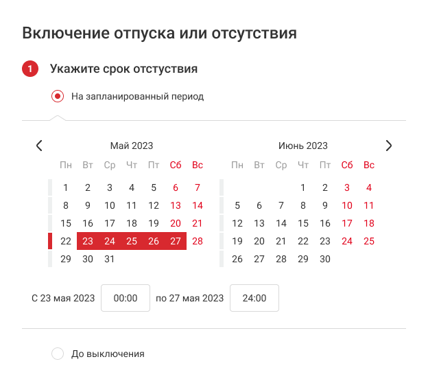 • На запланированный период – если точно знаете, сколько дней сотрудник будет отсутствовать (например, когда сотрудник в отпуске).