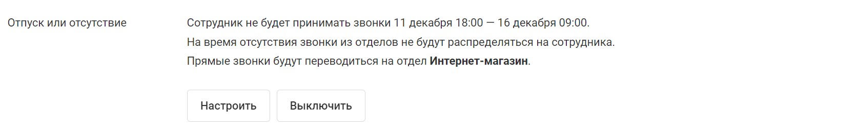 Отпуск или больничный сотрудника – не повод терять прямые звонки на его номер. Теперь можно за пару кликов настроить период отсутствия менеджера, и тогда: