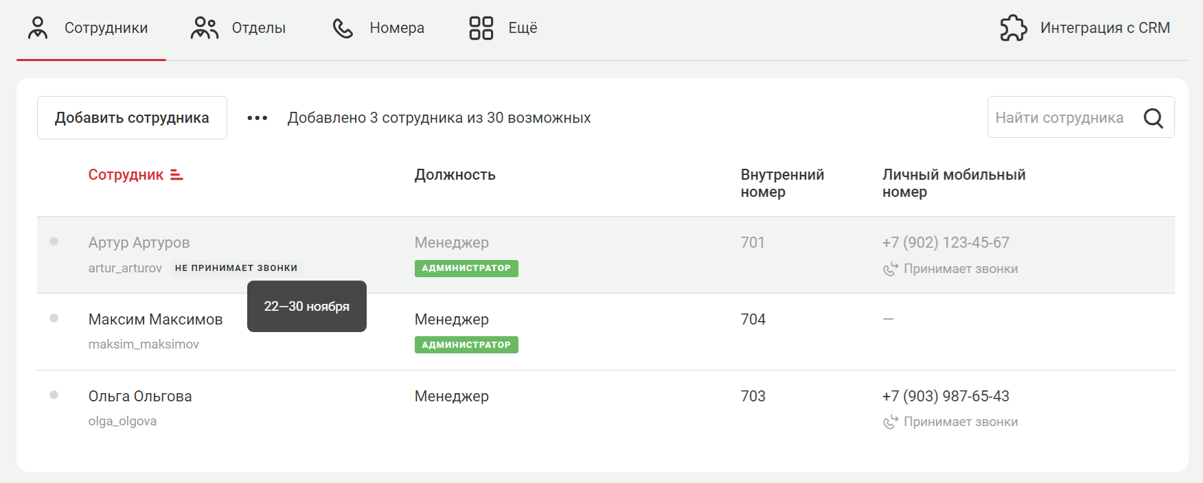 В период отсутствия менеджера на вкладке Сотрудники рядом с его именем появится серая плашка «Не принимает звонки». Чтобы узнать, когда менеджер вернется к работе, наведите курсор на эту плашку.