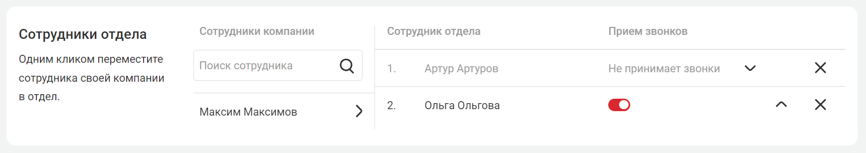 Также посмотреть, какие сотрудники не принимают звонки, можно в настройках отдела.