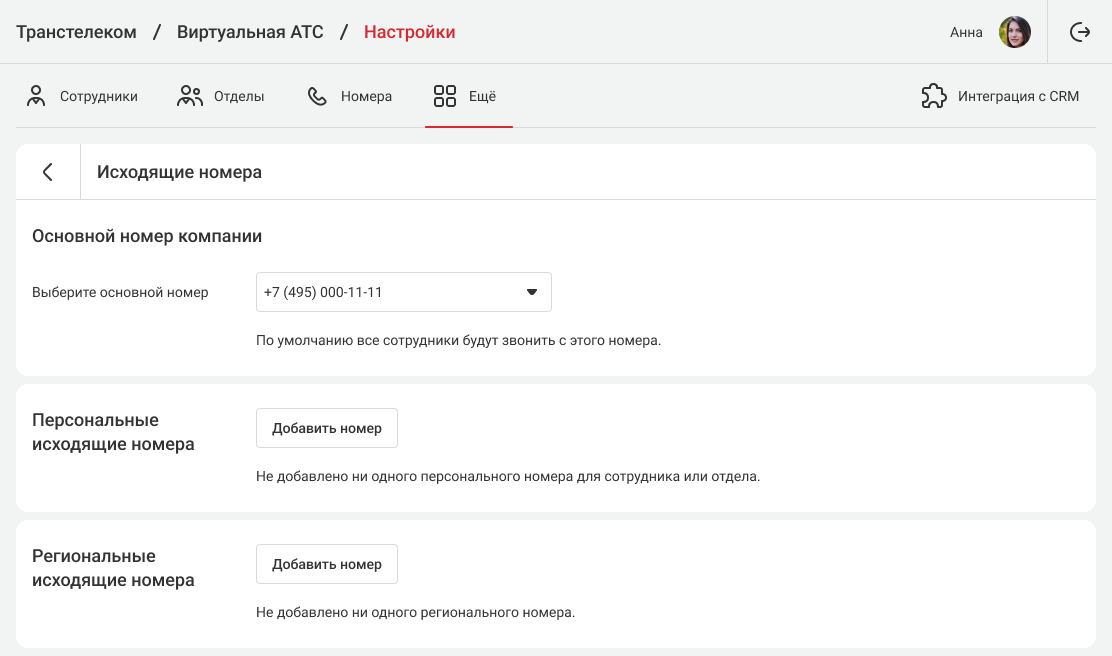 Чтобы ваши сотрудники могли звонить клиентам с разных номеров, нужно установить эти номера в качестве исходящих для определенной категории звонков. В АТС есть три категории исходящих номеров: