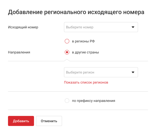 Чтобы выбрать исходящий номер для региона РФ: 1. В блоке «Региональные исходящие номера» нажмите на кнопку «Добавить номер». 2. Во всплывающем окне выберите исходящий номер телефона. 3. По умолчанию выбрано направление «в регионы РФ». В раскрывающемся списке выберите регион, при звонках в который будет подставляться указанный выше номер.