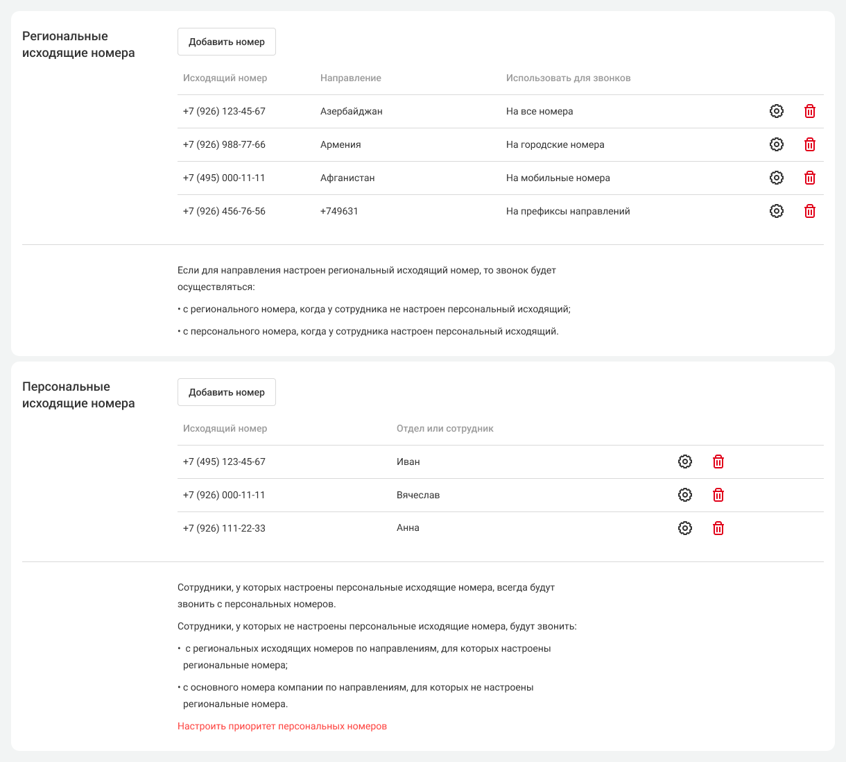 4. Нажмите «Добавить». 5. Региональный номер отобразиться в таблице региональных исходящих. Проверьте настройки номера — если их нужно отредактировать, нажмите на шестеренку. Если хотите убрать этот номер из списка региональных, вы сможете удалить его, нажав на корзину.