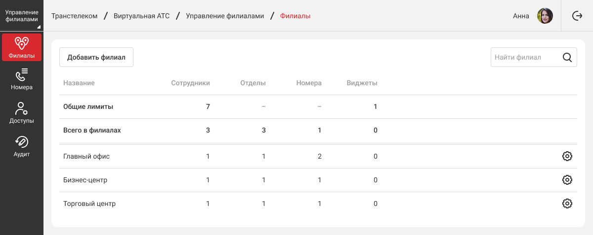 В кабинете управления филиалами можно редактировать настройки сразу по всем филиалам. Также здесь можно создавать новые филиалы, распределять номера между филиалами, выдавать доступы к их администрированию или просмотру и отслеживать историю действий сразу по всем доменам компании.