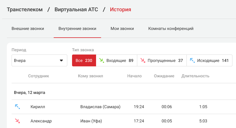 Все, теперь вы можете совершать и переводить звонки по коротким (внутренним) номерам между Виртуальными АТС. Такие вызовы будут отображаться в Истории на вкладке Внутренние вызовы, и их можно будет прослушать. В колонке «Кому звонил» в скобках будет указано название филиала, к которому относится менеджер.